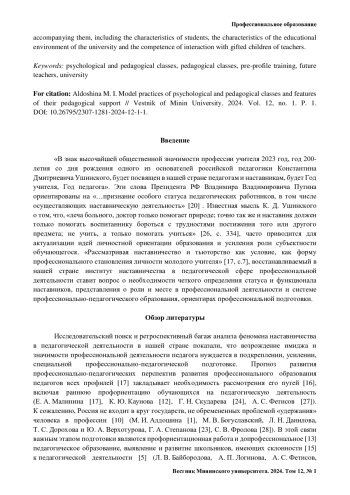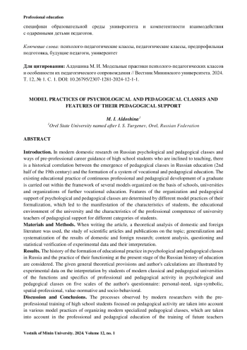 Введение. В современных отечественных исследованиях, посвященных российским психолого-педагогическим классам и путям допрофессиональной профориентации старшеклассников, склонных к педагогической деятельности, отмечается историческая соотнесенность возникновения в российском образовании педагогических классов (2 пол. ХӀХ века) и складывания системы профессионально-педагогического образования. Существующая образовательная практика непрерывного профессионально-педагогического становления выпускника осуществляется в рамках нескольких моделей, организуемых на базе школ, университетов и организаций ДПО. Особенности организации и педагогического сопровождения психолого-педагогических классов детерминированы разными модельными практиками их формализации, что обусловило проявление особенностей обучающихся, образовательной среды университета и характеристик профессиональной компетентности преподавателей университета педагогического сопровождения разных категорий обучающихся.