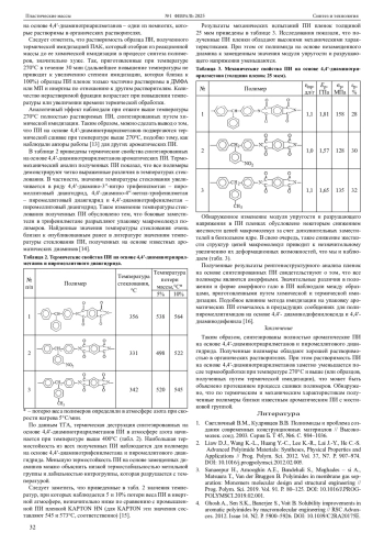 13. Harvey B.G., Yandek G.R., Lamb J.T., Eck W.S., Garrison M.D., Davis M.C. Synthesis and characterization of a high temperature thermosetting polyimide oligomer derived from a non-toxic, sustainable bisaniline // RSC Advances. 2017. N7. P. 23149-23156. DOI: 10.1039/С7RA02182H.