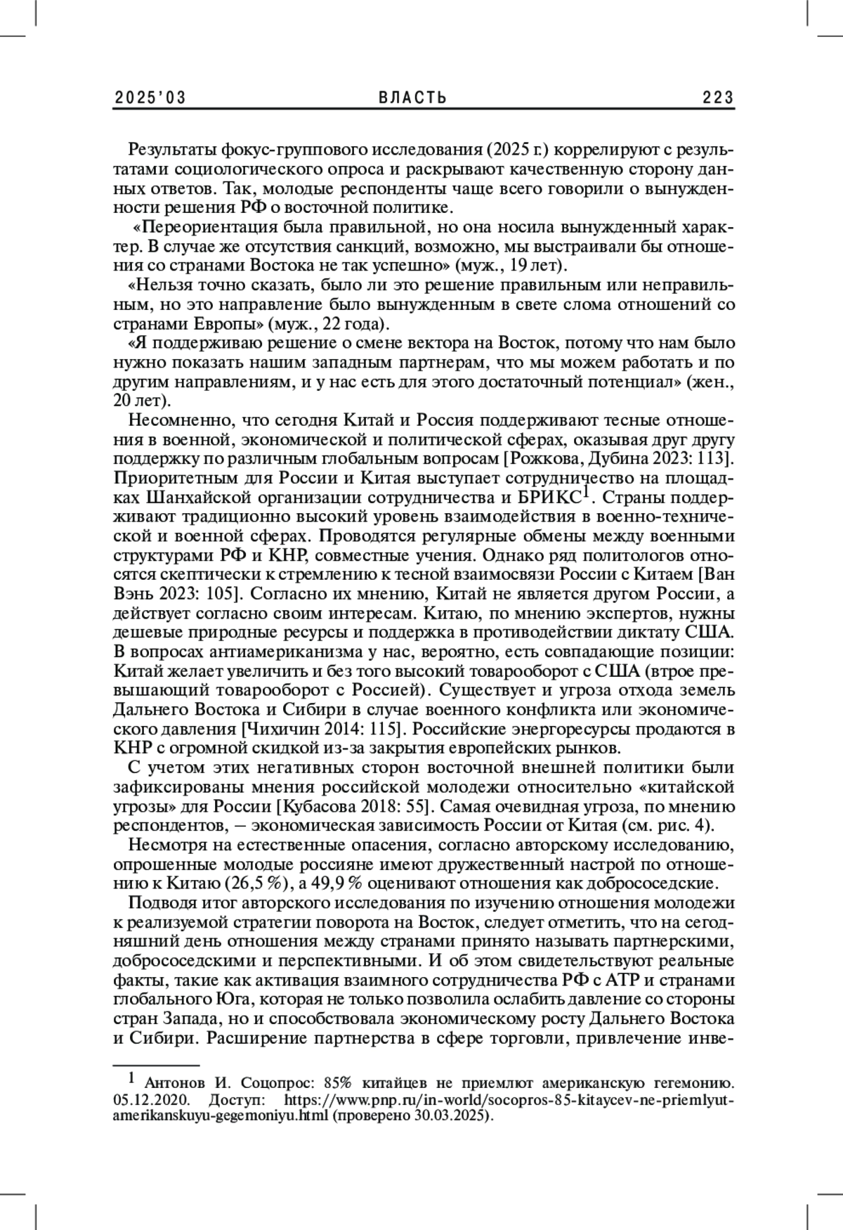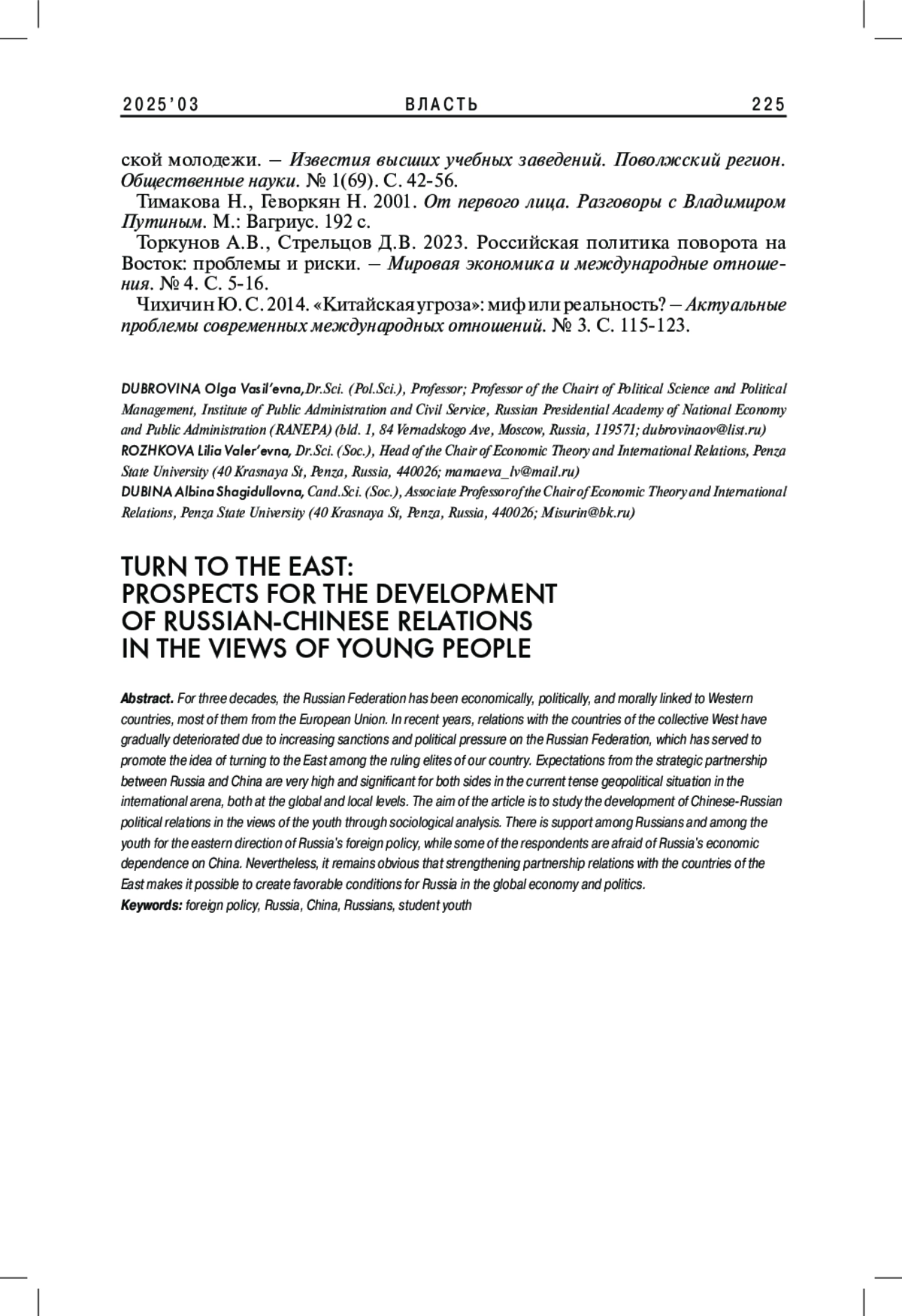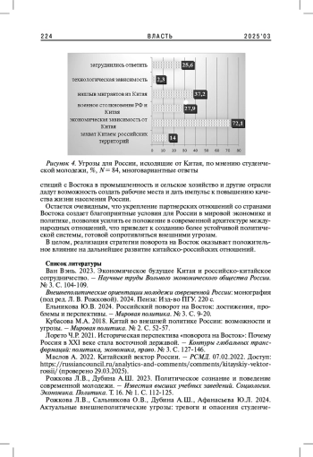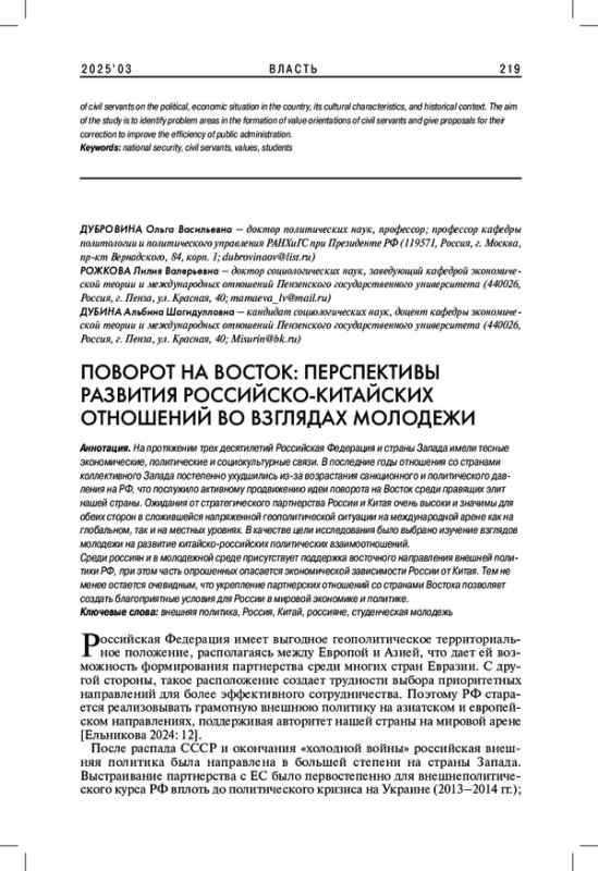 ДУБРОВИНА О. В., РОЖКОВА Л. В., ДУБИНА А. Ш. ПОВОРОТ НА ВОСТОК: ПЕРСПЕКТИВЫ РАЗВИТИЯ РОССИЙСКО-КИТАЙСКИХ ОТНОШЕНИЙ ВО ВЗГЛЯДАХ МОЛОДЕЖИ // ВЛАСТЬ. 2025. ТОМ 33 № 3