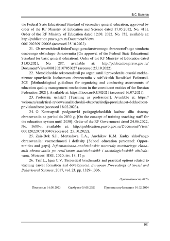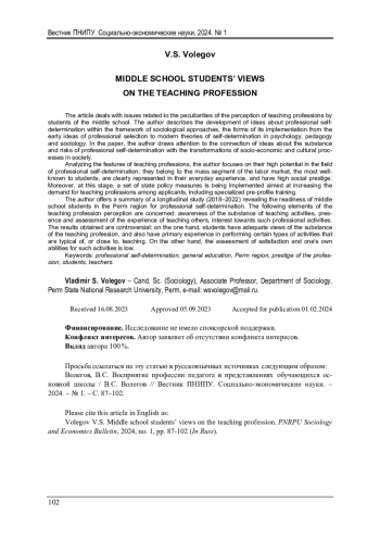 ВОЛЕГОВ В. С. ВОСПРИЯТИЕ ПРОФЕССИИ ПЕДАГОГА В ПРЕДСТАВЛЕНИЯХ ОБУЧАЮЩИХСЯ ОСНОВНОЙ ШКОЛЫ // ВЕСТНИК ПЕРМСКОГО НАЦИОНАЛЬНОГО ИССЛЕДОВАТЕЛЬСКОГО ПОЛИТЕХНИЧЕСКОГО УНИВЕРСИТЕТА. СОЦИАЛЬНО-ЭКОНОМИЧЕСКИЕ НАУКИ. 2024. № 1