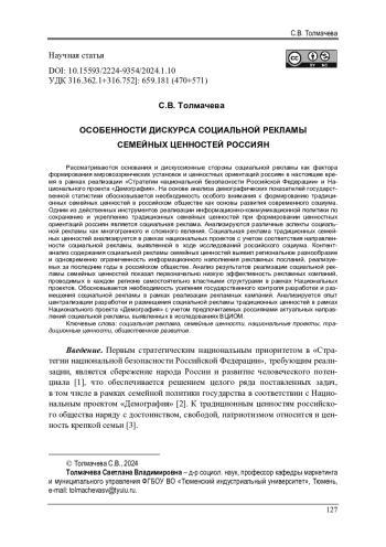 Рассматриваются основания и дискуссионные стороны социальной рекламы как фактора формирования мировоззренческих установок и ценностных ориентаций россиян в настоящее время в рамках реализации «Стратегии национальной безопасности Российской Федерации» и Национального проекта «Демография». На основе анализа демографических показателей государственной статистики обосновывается необходимость особого внимания к формированию традиционных семейных ценностей в российском обществе как основы развития современного социума. Одним из действенных инструментов реализации информационно-коммуникационной политики по сохранению и укреплению традиционных семейных ценностей при формировании ценностных ориентаций россиян является социальная реклама. Анализируются различные аспекты социальной рекламы как многогранного и сложного явления. Социальная реклама традиционных семейных ценностей анализируется в рамках национальных проектов с учетом соответствия направленности социальной рекламы, выявленной в ходе исследований российского социума. Контентанализ содержания социальной рекламы семейных ценностей выявил региональное разнообразие и одновременно ограниченность информационного наполнения рекламных посланий, реализуемых за последние годы в российском обществе. Анализ результатов реализации социальной рекламы семейных ценностей показал первоначально низкую эффективность рекламных компаний, проводимых в каждом регионе самостоятельно властными структурами в рамках Национальных проектов. Обосновывается необходимость усиления государственного контроля разработки и размещения социальной рекламы в рамках реализации рекламных кампаний. Анализируется опыт централизации разработки и размещения социальной рекламы традиционных ценностей в рамках Национального проекта «Демография» с учетом предпочитаемых россиянами актуальных направлений социальной рекламы, выявленных в исследованиях ВЦИОМ.