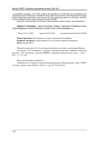 8. Автаева Н.О. Семейные ценности в рекламном дискурсе телевидения и интернета // Вестник ВГУ. Филология. Журналистика. - 2022. - № 4. - С. 64-72. EDN: AOAUXU