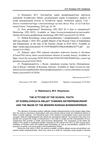 20. Рахмеева, И.И. Cтуденты экономического университета как резерв для развития предпринимательства в регионах России / И.И. Рахмеева, М.В. Клейменов // Вестник экономики, права и социологии. - 2021. - № 3. - С. 35-39. EDN: DKZJJF
