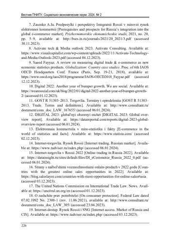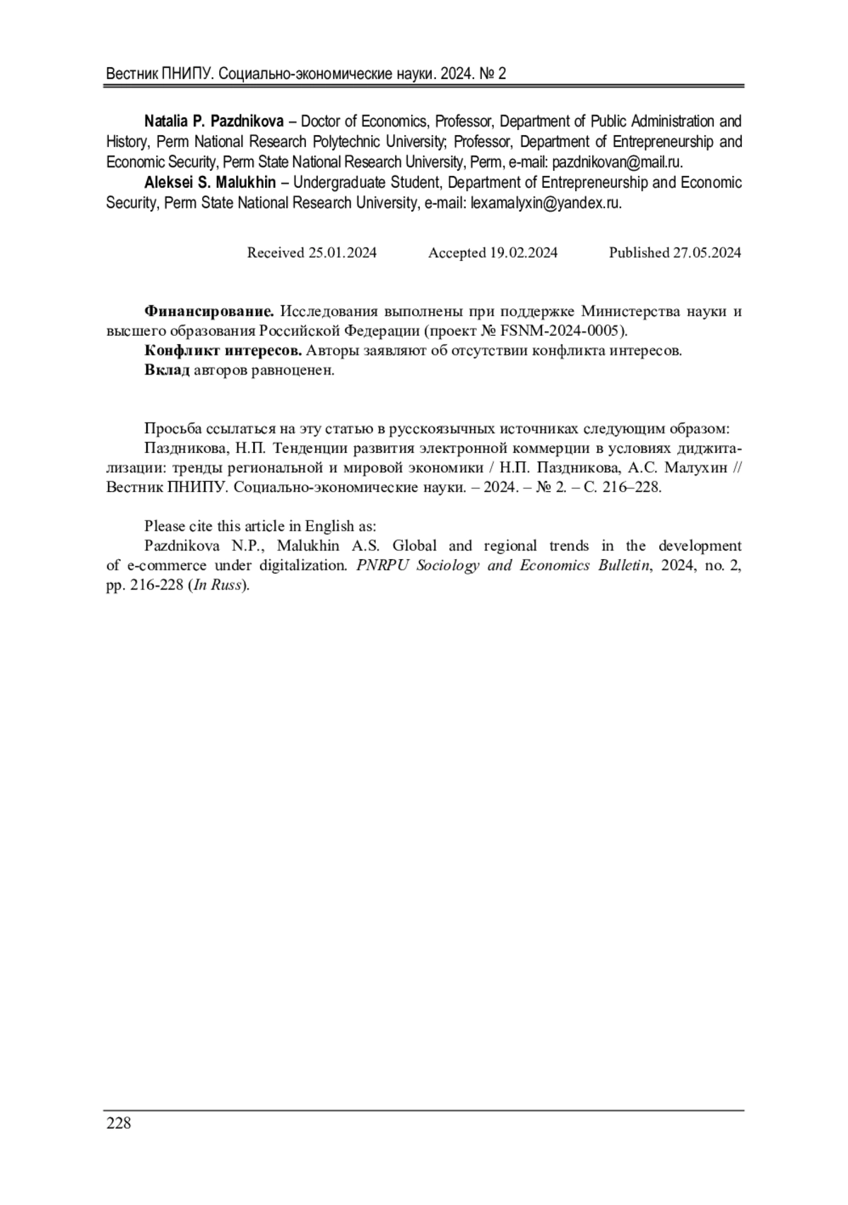 ПАЗДНИКОВА Н. П., МАЛУХИН А. С. ТЕНДЕНЦИИ РАЗВИТИЯ ЭЛЕКТРОННОЙ КОММЕРЦИИ В УСЛОВИЯХ ДИДЖИТАЛИЗАЦИИ: ТРЕНДЫ РЕГИОНАЛЬНОЙ И МИРОВОЙ ЭКОНОМИКИ // ВЕСТНИК ПЕРМСКОГО НАЦИОНАЛЬНОГО ИССЛЕДОВАТЕЛЬСКОГО ПОЛИТЕХНИЧЕСКОГО УНИВЕРСИТЕТА. СОЦИАЛЬНО-ЭКОНОМИЧЕСКИЕ НАУКИ. 2024. № 2