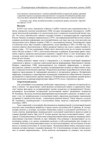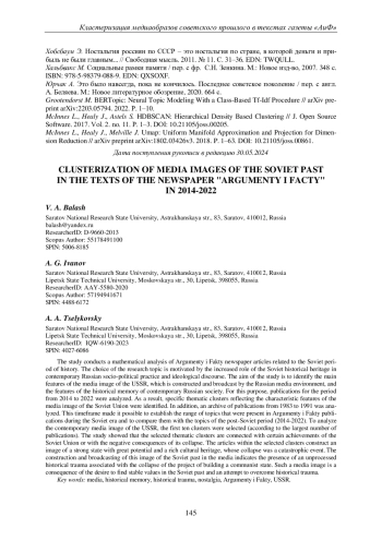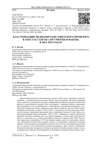 Представлены результаты математического анализа статей газеты «Аргументы и факты», связанных с советским периодом истории. Выбор темы исследования обусловлен возросшей ролью советского исторического наследия в современной российской социально-политической практике и идеологическом дискурсе. Цель исследования - выявление наиболее характерных черт медиаобраза СССР, конструируемого и транслируемого российской медиасредой, и особенностей исторической памяти современного российского общества. Для этого были проанализированы публикации за период с 2014 по 2022 г., в результате чего были выделены тематические кластеры, отражающие характерные черты медиаобраза Советского Союза. Кроме того, был проанализирован архив публикаций с 1983 по 1991 г. Обращение к данному временному диапазону позволило установить круг тем, присутствовавших в статьях газеты «Аргументы и факты», и сопоставить их с темами публикаций постсоветского периода (2014-2022). Для анализа современного медиаобраза СССР были выбраны первые десять (по наибольшему количеству публикаций) кластеров. Исследование показало, что выделенные тематические кластеры связаны с теми или иными достижениями Советского Союза или же с негативными последствиями его распада. Статьи выделенных кластеров конструируют образ сильного, обладающего большим потенциалом государства с богатым культурным наследием, распад которого стал катастрофическим событием. Конструирование и трансляция в медиасреде данного образа советского прошлого свидетельствуют о наличии непроработанной исторической травмы, связанной с крушением проекта построения коммунистического государства. Подобный медиаобраз является следствием стремления обрести устойчивые ценностные ориентиры в советском прошлом.