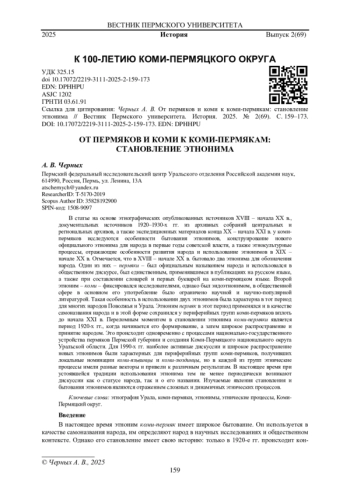 ЧЕРНЫХ А. В. ОТ ПЕРМЯКОВ И КОМИ К КОМИ-ПЕРМЯКАМ: СТАНОВЛЕНИЕ ЭТНОНИМА // ВЕСТНИК ПЕРМСКОГО УНИВЕРСИТЕТА. ИСТОРИЯ. 2025. № 2 (69)