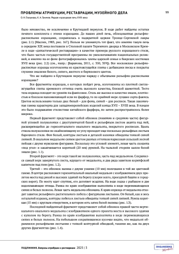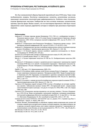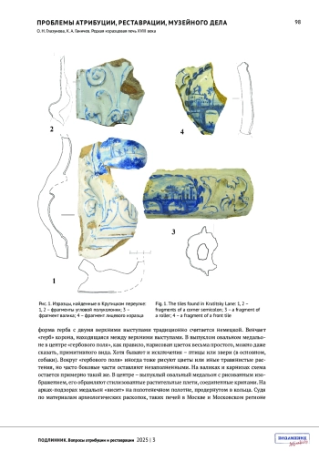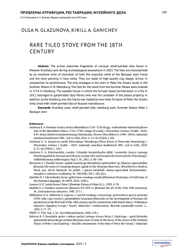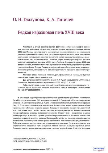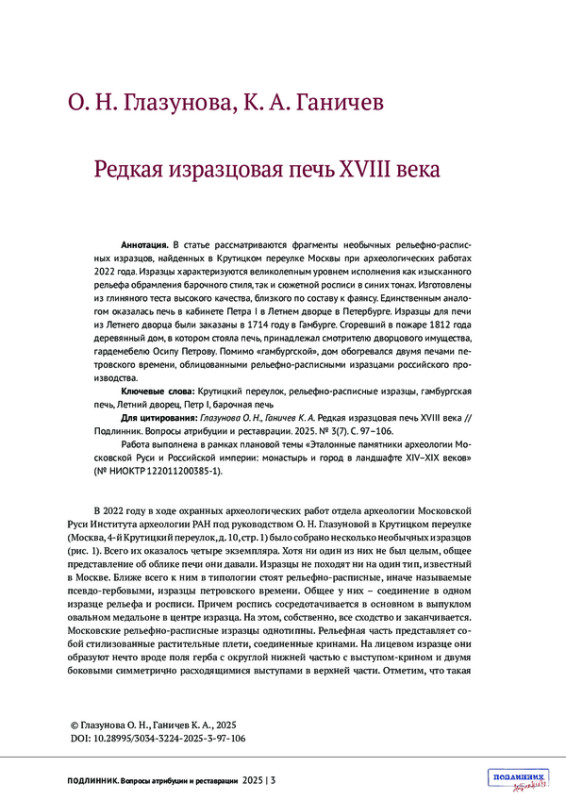 ГЛАЗУНОВА О.Н., ГАНИЧЕВ К.А. РЕДКАЯ ИЗРАЗЦОВАЯ ПЕЧЬ XVIII ВЕКА // ПОДЛИННИК. ВОПРОСЫ АТРИБУЦИИ И РЕСТАВРАЦИИ. 2025. № 3 (7)