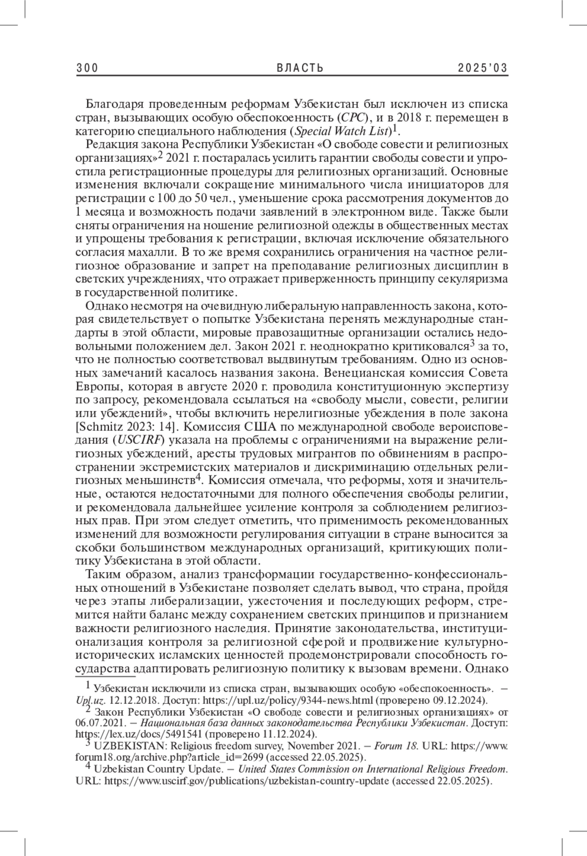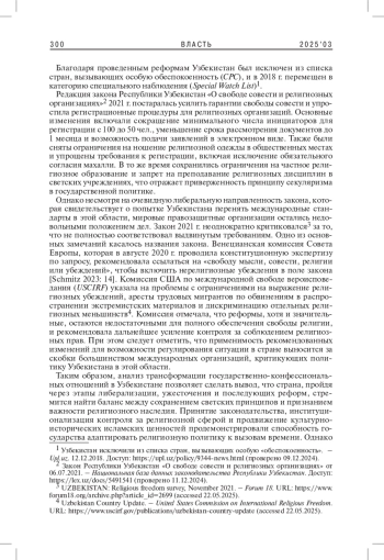 ПРОКОПЕНКО Т. П. ТРАНСФОРМАЦИЯ ГОСУДАРСТВЕННО-КОНФЕССИОНАЛЬНЫХ ОТНОШЕНИЙ В УЗБЕКИСТАНЕ ОТ ОБРЕТЕНИЯ НЕЗАВИСИМОСТИ ДО РЕФОРМ 2020-Х ГГ.: КРАТКИЙ ОБЗОР // ВЛАСТЬ. 2025. ТОМ 33 № 3