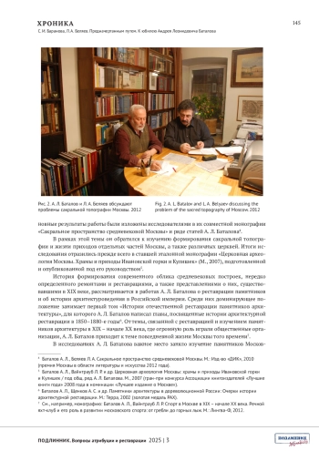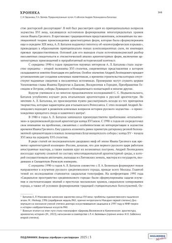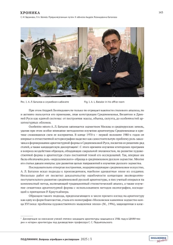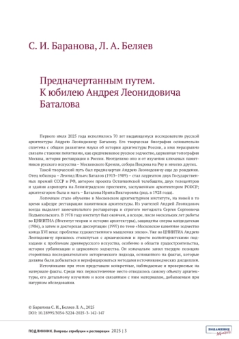 Первого июля 2025 года исполнилось 70 лет выдающемуся исследователю русской архитектуры Андрею Леонидовичу Баталову. Его творческая биография основательно сплетена с общим развитием науки об истории архитектуры России, а имя неразрывно связано с такими понятиями, как средневековое русское зодчество, церковная топография Москвы, история реставрации в России. Неотделимо оно и от изучения ключевых памятников русского искусства – Московского Кремля, собора Покрова на Рву и многих других.