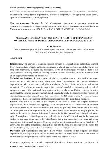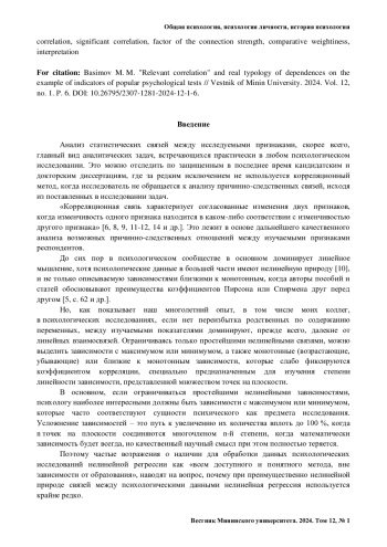 БАСИМОВ М. М. «ЗНАЧИМАЯ» КОРРЕЛЯЦИЯ И РЕАЛЬНАЯ ТИПОЛОГИЯ ЗАВИСИМОСТЕЙ НА ПРИМЕРЕ ПОКАЗАТЕЛЕЙ ПОПУЛЯРНЫХ ПСИХОДИАГНОСТИЧЕСКИХ МЕТОДИК // ВЕСТНИК МИНИНСКОГО УНИВЕРСИТЕТА. 2024. ТОМ 12, № 1