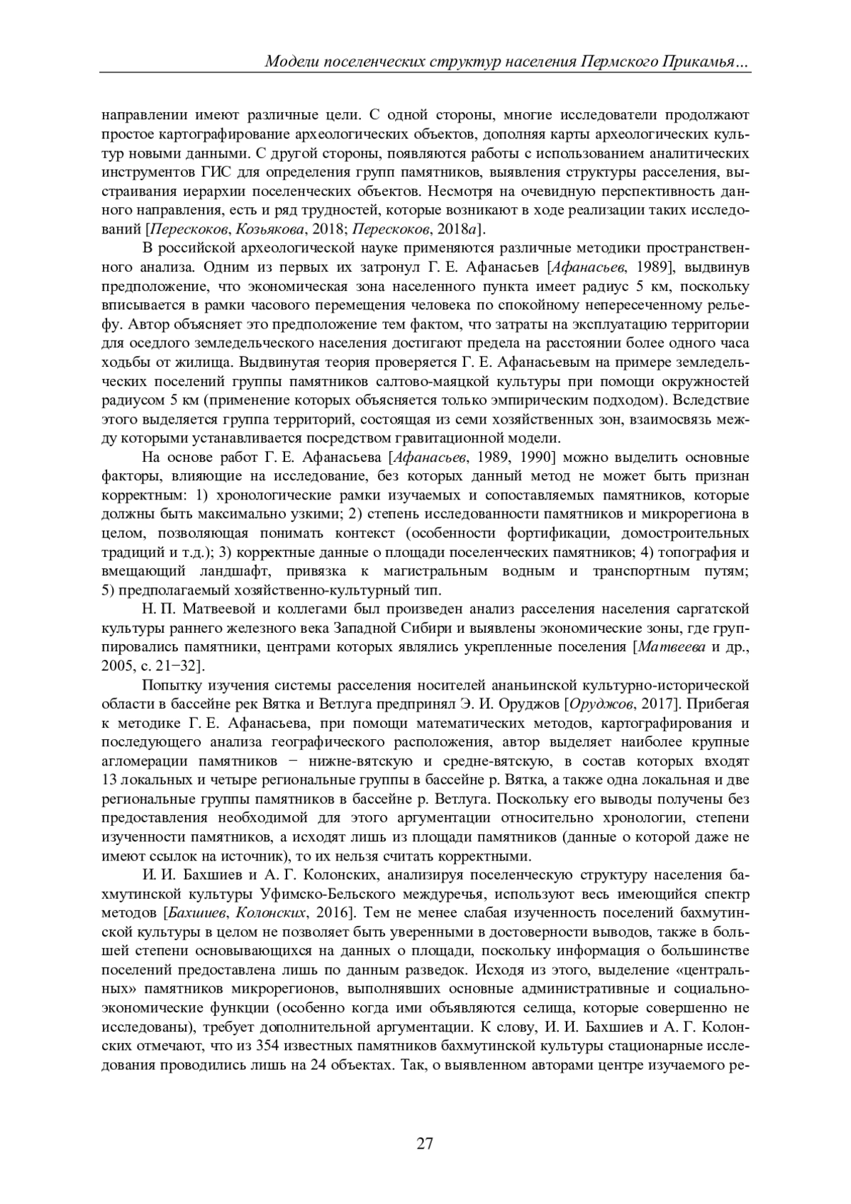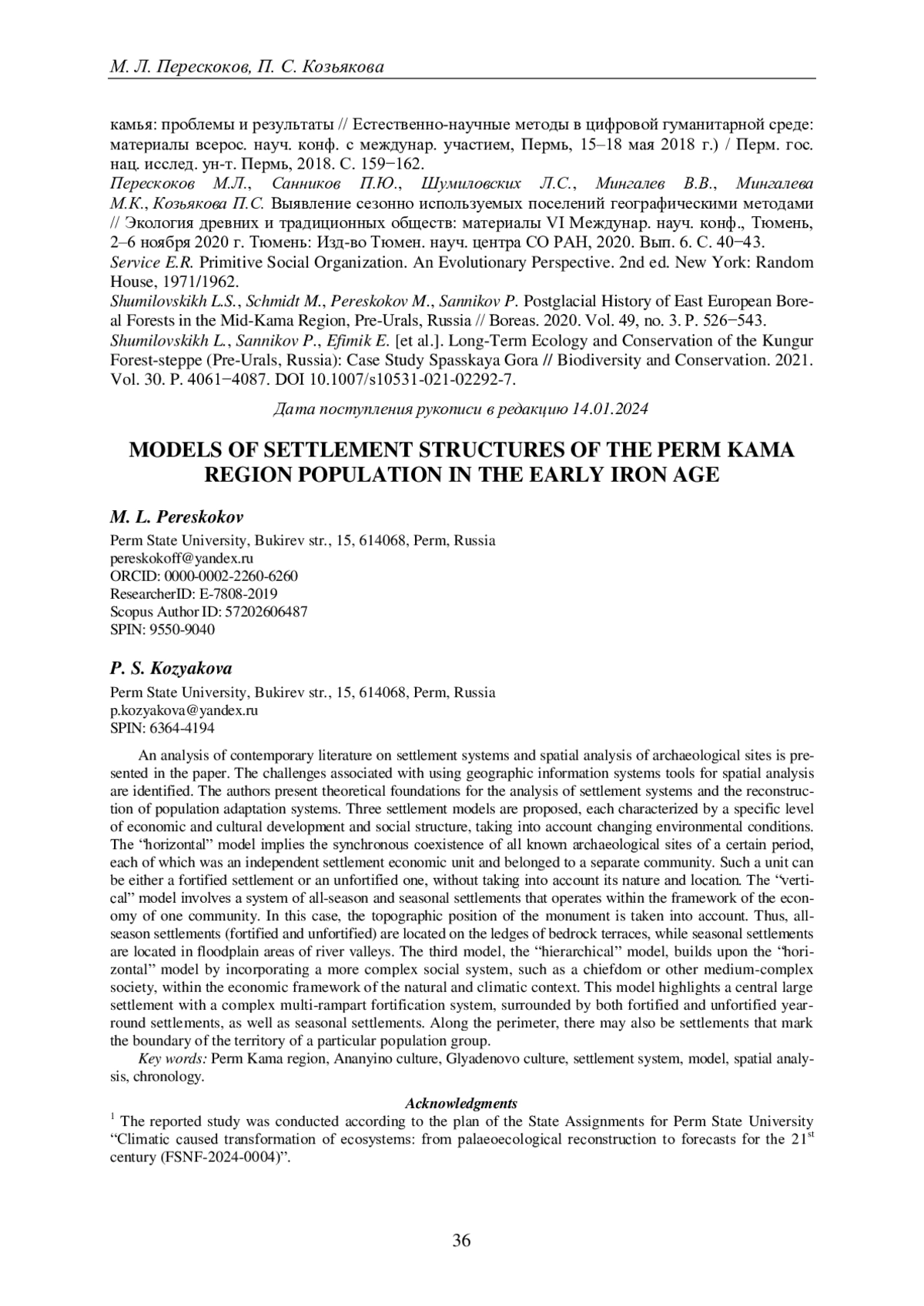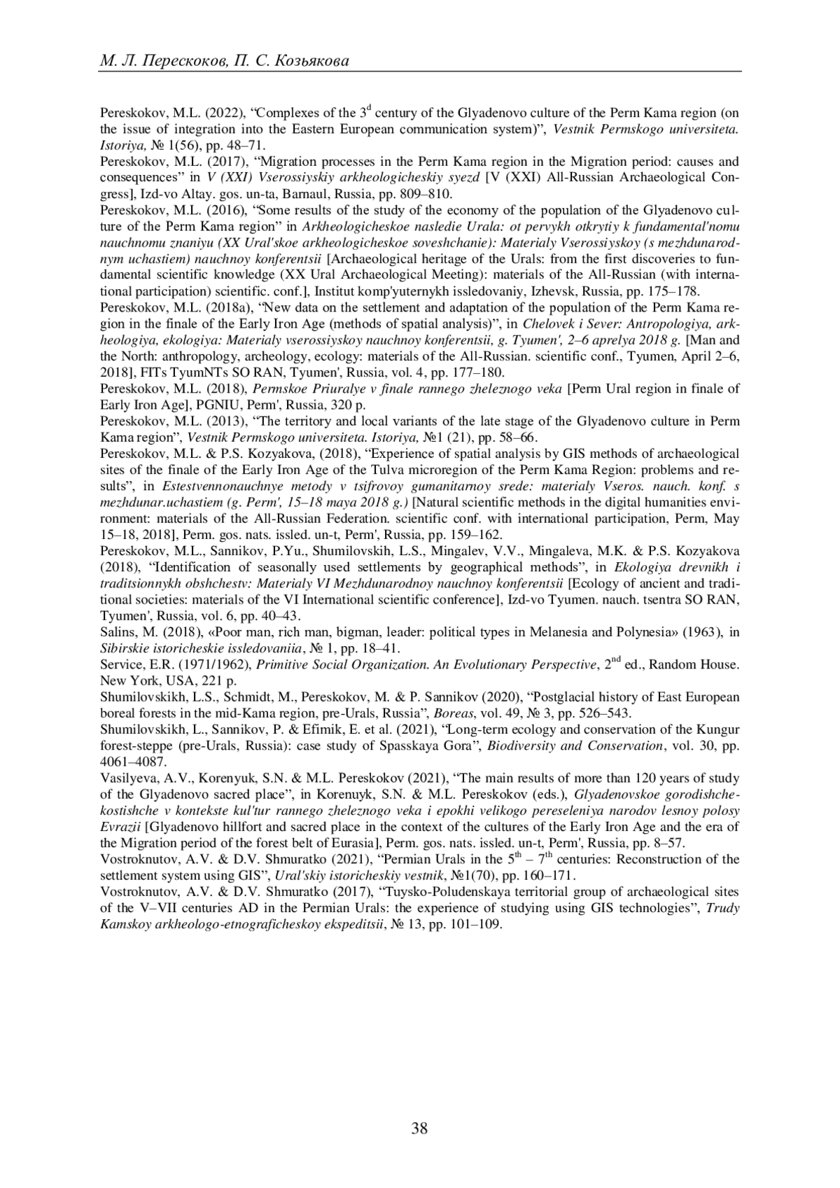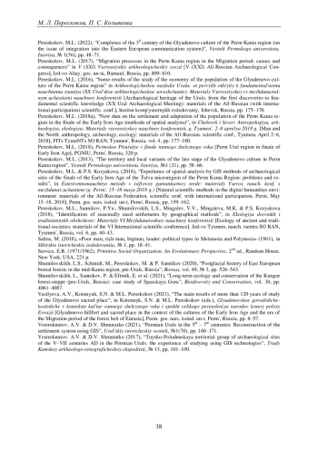 22. Перескоков М.Л. Новые данные о расселении и адаптации населения Пермского Прикамья в финале раннего железного века (методы пространственного анализа) // Человек и Север: антропология, археология, экология: материалы всерос. науч. конф., Тюмень, 2-6 апреля 2018 г. Тюмень, 2018а. Вып. 4. С. 177-180. EDN: YVHFMH