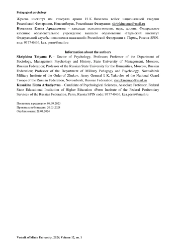 Обсуждение и заключения. Предложенная авторами профессиограмма отражает динамику изменения ведущей деятельности личности на разных стадиях профессионального становления, что позволяет осуществлять психологическое сопровождение процесса профессиональной подготовки специалиста-кинолога МВД РФ.