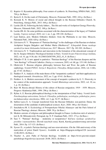 23. Пешков А. А. Современная оценка концепции неопатрического синтеза Г. В. Флоровского в контексте модернизационного подхода // Вестник Мининского университета. 2022. Т. 10, № 1. С. 10.