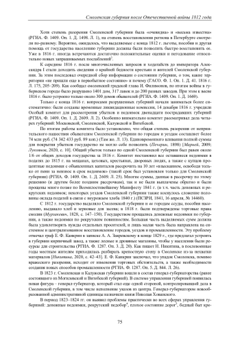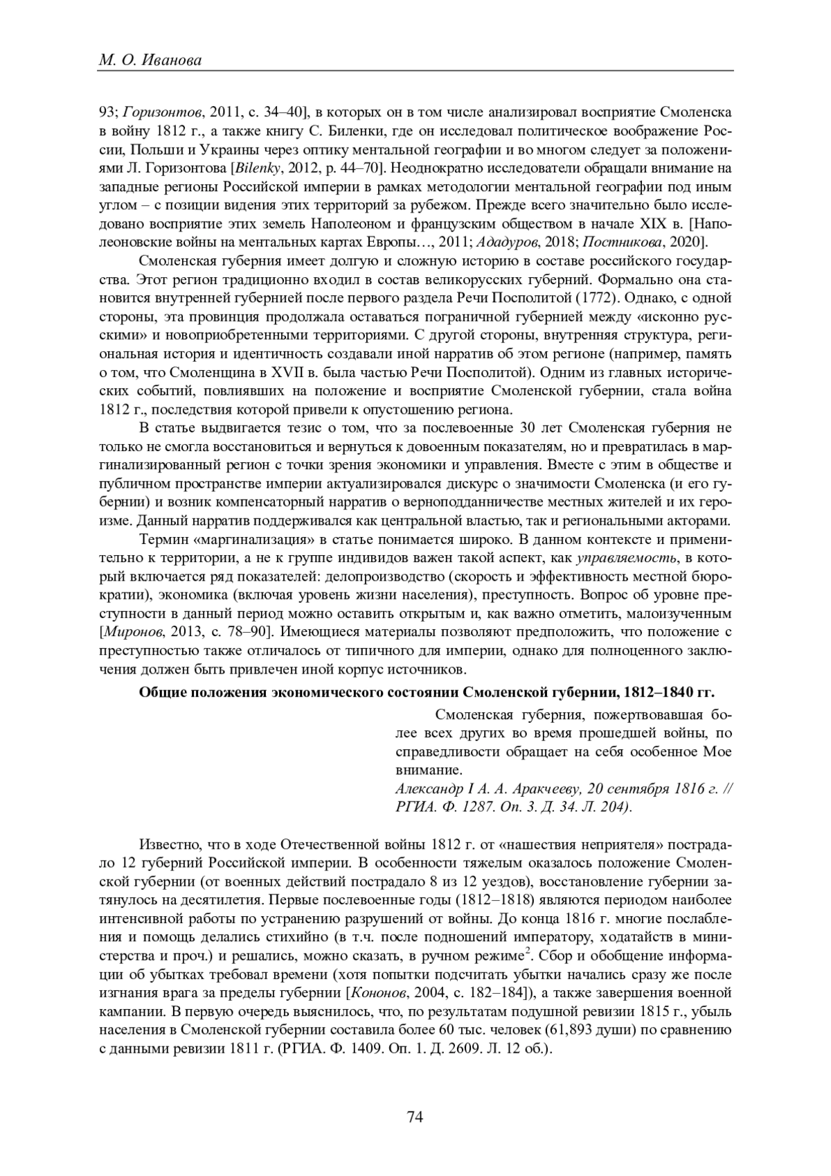 Отечественная война 1812 г. является одним из важнейших событий для всей истории Российской империи и одним из самых исследованных периодов в ней. Преимущественно историографический фокус смещен на военно-политическую историю Отечественной войны, в том числе среди исследователей, занимающихся исключительно Смоленской губернией. В основном научная литература посвящена положению данной губернии в период войны 1812 г. Период же ее восстановления является практически не проанализированным, хотя и привлекает внимание исследователей в рамках общей истории Смоленщины уже с позднеимперского периода [Вороновский, 1912; Грачев, 1912; Андреев, 1940]. Здесь надо отметить работы современных смоленских историков [Кононов, 2004; Никитина, 2009, 2010, 2020], чьи исследования, однако, базируются преимущественно на историографии ХХ в., документах Смоленского архива (ГАСО), а история губернии рассматривается в отрыве от общеимперского контекста.
