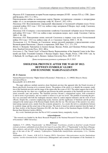 15. Никитина Н.В. К вопросу о восстановлении хозяйства Смоленской губернии после Отечественной войны 1812 года // 1812 год: война и мир: материалы всерос. науч. конф. Смоленск: Свиток, 2009. С. 99-106.