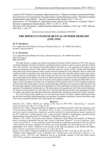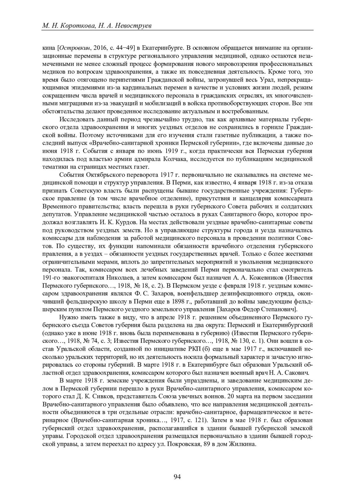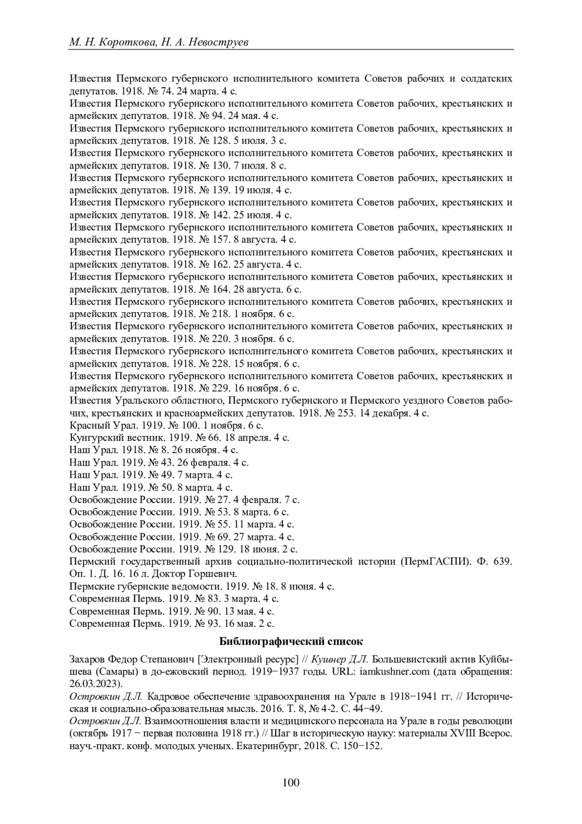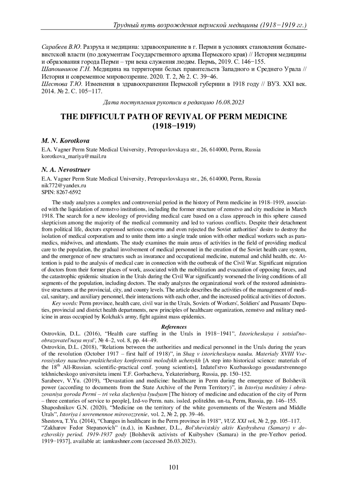 КОРОТКОВА М. Н., НЕВОСТРУЕВ Н. А. ТРУДНЫЙ ПУТЬ ВОЗРОЖДЕНИЯ ПЕРМСКОЙ МЕДИЦИНЫ (1918-1919 ГОДЫ) // ВЕСТНИК ПЕРМСКОГО УНИВЕРСИТЕТА. ИСТОРИЯ. 2024. № 1 (64)