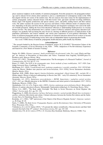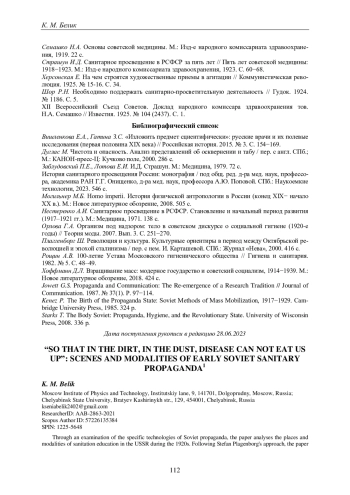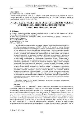 БЕЛИК К. М. "ЧТОБЫ НАС В ГРЯЗИ, В ПЫЛИ СЪЕСТЬ БОЛЕЗНИ НЕ МОГЛИ": СЦЕНЫ И МОДАЛЬНОСТИ РАННЕСОВЕТСКОЙ САНИТАРНОЙ ПРОПАГАНДЫ // ВЕСТНИК ПЕРМСКОГО УНИВЕРСИТЕТА. ИСТОРИЯ. 2024. № 1 (64)