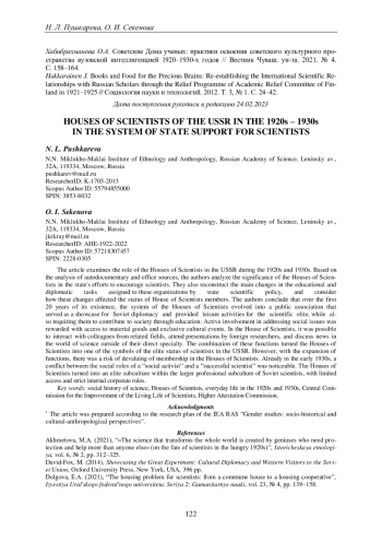 На основе автодокументальных и делопроизводственных источников проанализированы значение и основные функции советских Домов ученых в 1920-1930-е гг., их место в системе государственного поощрения научных работников. Реконструированы перемены в структуре задач, которые государственная научная политика ставила перед этими организациями. Изменение функций Домов ученых влияло на статус их членов: за 20 лет существования эти уникальные в своем роде объединения научных работников превратились в оплот советской витринной дипломатии и форму конструируемой сверху элитарности. Эти организации обеспечивали продуктивный досуг научной элиты, который одновременно приносил видимую (а именно - просветительскую) пользу обществу. Активная готовность участвовать в решении поставленных властью задач вознаграждалась для членов Домов ученых доступом к материальным благам и уникальным культурным мероприятиям. Созданные во многих научных центрах, эти организации становились локусами междисциплинарной профессиональной коммуникации, общения с представителями смежных научных отраслей, дискуссий во время докладов иностранных исследователей и в то же время обеспечивали ряд привилегий, касавшихся сферы досуга. Эффект от сочетания перечисленных и ряда иных функций (в том числе релаксационных, оздоровительных, просветительских и пр.) превратил Дома ученых не только в центры коллективной научной мысли, но и в один из символов элитарности части советских научных работников. По мере расширения функций и роста числа их членов возрастали и риски девальвации членства в этих объединениях. В связи с этим с начала 1930-х гг. стал заметен конфликт между социальными ролями общественника и успешного ученого. К концу 1930-х гг. Дома ученых с ограниченным доступом и собственными жесткими внутренними корпоративными правилами стали полем конструирования элитарности внутри профессиональной субкультуры работников научно-исследовательских институтов, некоторого разделения на тех, кто имел членский билет Дома ученых, и на тех, кто не имел его, в общей массе академических работников.