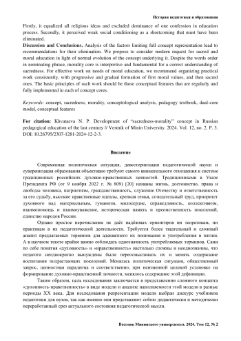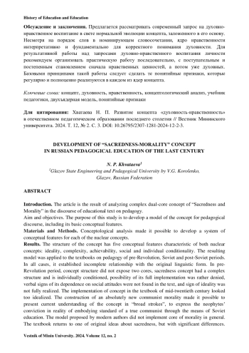 ХВАТАЕВА Н. П. РАЗВИТИЕ КОНЦЕПТА «ДУХОВНОСТЬ-НРАВСТВЕННОСТЬ» В ОТЕЧЕСТВЕННОМ ПЕДАГОГИЧЕСКОМ ОБРАЗОВАНИИ ПОСЛЕДНЕГО СТОЛЕТИЯ // ВЕСТНИК МИНИНСКОГО УНИВЕРСИТЕТА. 2024. ТОМ 12, № 2