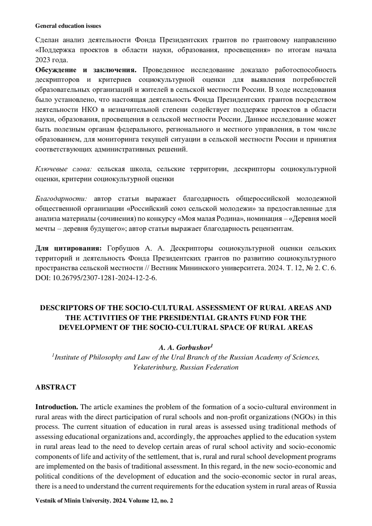 ГОРБУШОВ А. А. ДЕСКРИПТОРЫ СОЦИОКУЛЬТУРНОЙ ОЦЕНКИ СЕЛЬСКИХ ТЕРРИТОРИЙ И ДЕЯТЕЛЬНОСТЬ ФОНДА ПРЕЗИДЕНТСКИХ ГРАНТОВ ПО РАЗВИТИЮ СОЦИОКУЛЬТУРНОГО ПРОСТРАНСТВА СЕЛЬСКОЙ МЕСТНОСТИ // ВЕСТНИК МИНИНСКОГО УНИВЕРСИТЕТА. 2024. ТОМ 12, № 2