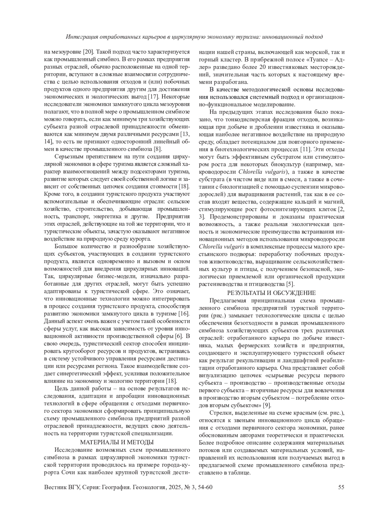 Цель - разработка схемы промышленного симбиоза предприятий разных отраслей в туристической зоне для создания замкнутых технологических циклов, обеспечения безотходности и формирования новых туристских объектов путем ландшафтной реабилитации карьеров с использованием тонкодисперсной фракции отходов добычи известняка в биотехнологических процессах. Материалы и методы. Исследование проводилось на примере города-курорта Сочи с применением системного подхода и организационно-функционального моделирования. Схема основана на концепции циркулярной экономики и результатах изучения инновационных технологий обращения с отходами. Результаты и обсуждение. Выявлены предпосылки и проблемы формирования циркулярной экономики туризма. Разработана схема промышленного симбиоза субъектов трех отраслей: отработанного карьера, малых фермерских хозяйств и туристского предприятия, с описанием материальных потоков. Модель интегрирует биотехнологии утилизации отходов добычи известняка и сельхозпроизводства. Показана возможность создания замкнутых циклов, уменьшающих негативное воздействие на среду, поддерживающих местное сельское хозяйство и формирующих новые туристские продукты. Приведены примеры реализованных проектов ландшафтной реабилитации карьеров. Выводы. Предложенная схема обеспечивает экономические выгоды, экологические и социальные преимущества. Она может служить основой для развития устойчивого и научно-познавательного туризма в районах отработанных карьеров, способствуя экологической безопасности и развитию циркулярной экономики на Черноморском побережье России.