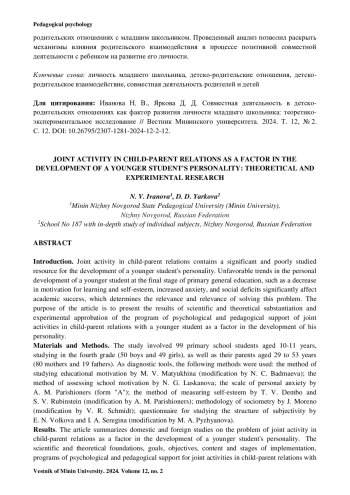 Введение. Совместная деятельность в детско-родительских отношениях содержит значительный и мало изученный ресурс развития личности младшего школьника. Неблагоприятные тенденции личностного развития младшего школьника на заключительном этапе начального общего образования, такие как снижение мотивации учения и самооценки, повышение тревожности, социальные дефициты, значимо влияют на академическую успешность, что обуславливает актуальность и востребованность решения данной проблемы. Цель статьи – представление результатов научно-теоретического обоснования и экспериментальной апробации программы психолого-педагогического сопровождения совместной деятельности в детско-родительских отношениях с младшим школьником как фактора развития его личности.