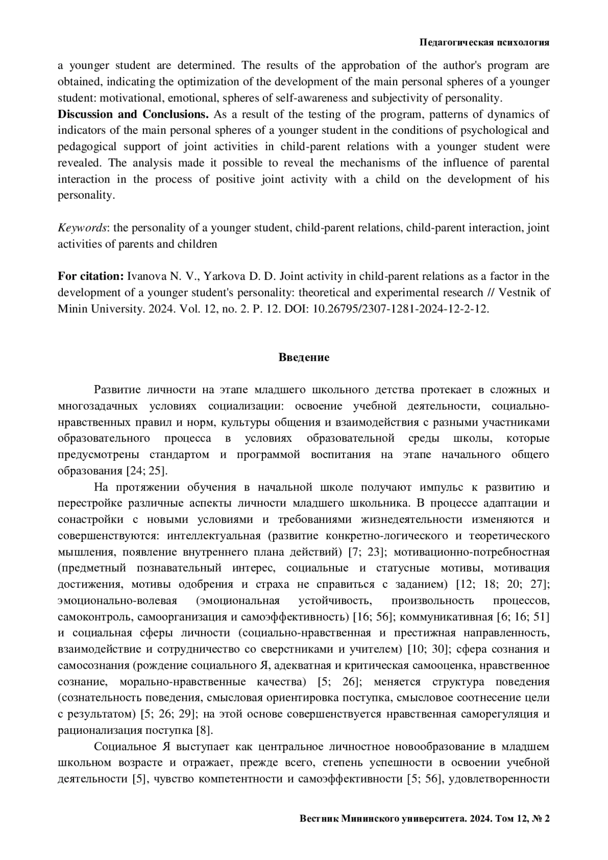 36. Яркова Д. Д. Совместная деятельность в контексте детско-родительских отношений с ребенком младшего школьного возраста // Вестник Санкт-петербургского военного института войск Национальной гвардии. 2023. № 4 (25). С. 81-87.