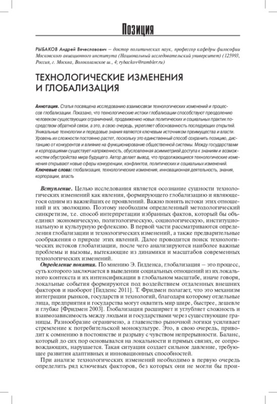 Статья посвящена исследованию взаимосвязи технологических изменений и процессов глобализации. Показано, что технологические истоки глобализации способствуют преодолению человеком существующих ограничений, продвижению новых политических и социальных практик посредством обратной связи, а это, в свою очередь, укрепляет обоснованность последующих открытий. Уникальные технологии и передовые знания являются ключевым источником преимущества и власти. Уровень их сложности постоянно растет, поскольку это единственный способ сохранить позицию, дистанцию от конкурентов и влияние на функционирование общественной системы. Между государствами и корпорациями существует напряженность, обусловленная асимметрией доступа к знаниям и возможностям обустройства мира будущего. Автор делает вывод, что продолжающиеся технологические изменения открывают новые сферы конкуренции, конфликтов, политических и социальных изменений.