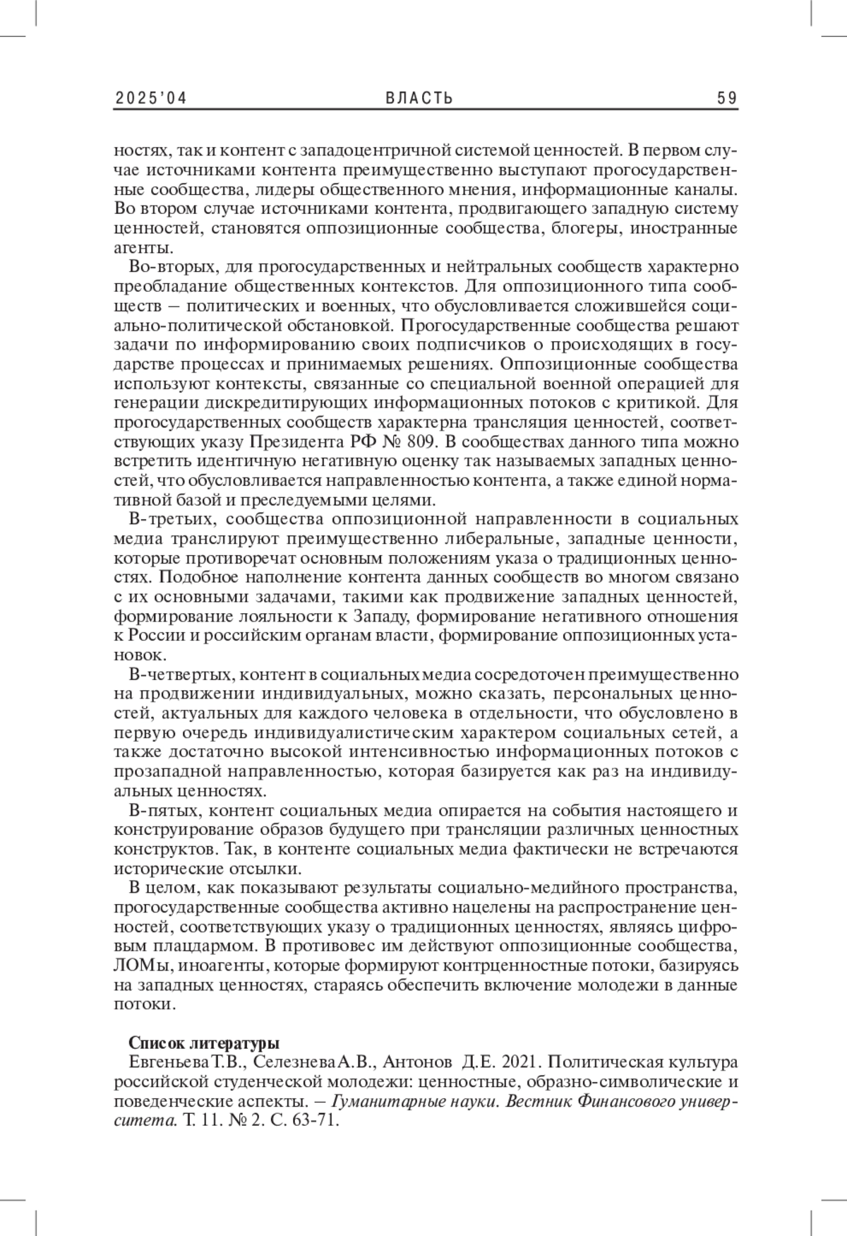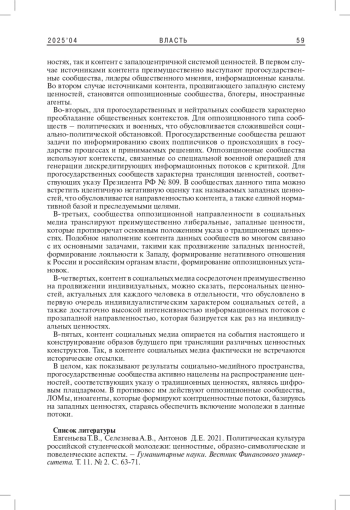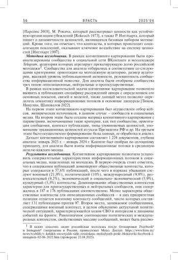 ДАВЫДОВА М. А. СОЦИАЛЬНЫЕ МЕДИА КАК ИСТОЧНИК ЦЕННОСТНЫХ УСТАНОВОК СОВРЕМЕННОЙ РОССИЙСКОЙ МОЛОДЕЖИ // ВЛАСТЬ. 2025. ТОМ 33 № 4