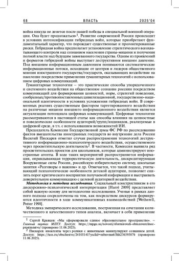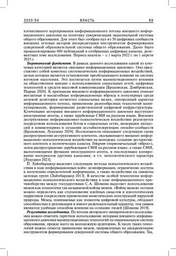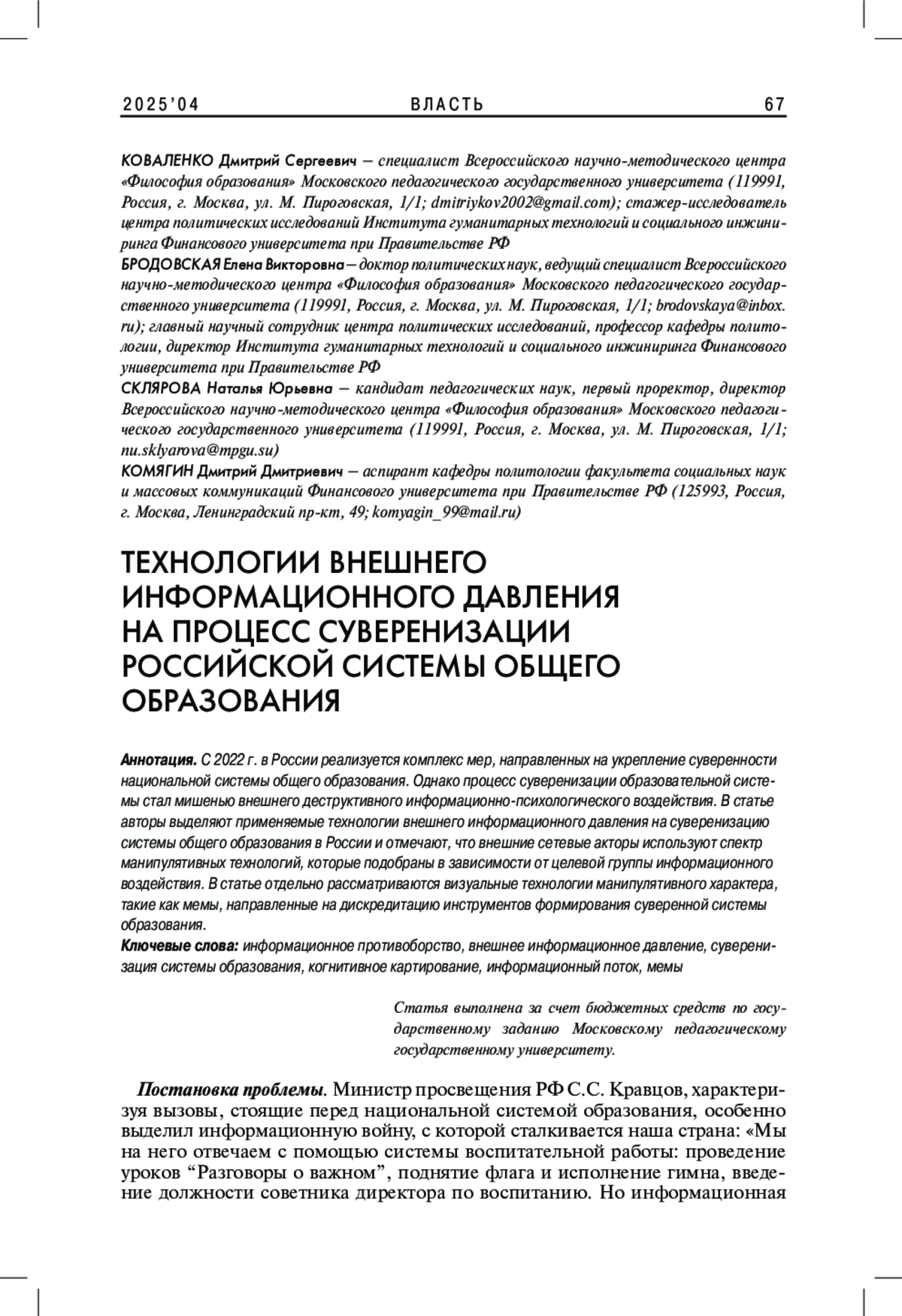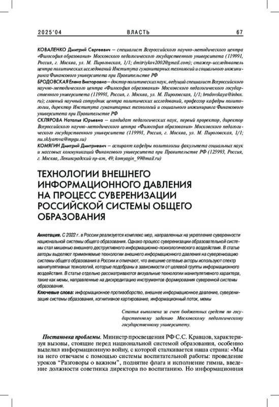 КОВАЛЕНКО Д. С., БРОДОВСКАЯ Е. В., СКЛЯРОВА Н. Ю., КОМЯГИН Д. Д. ТЕХНОЛОГИИ ВНЕШНЕГО ИНФОРМАЦИОННОГО ДАВЛЕНИЯ НА ПРОЦЕСС СУВЕРЕНИЗАЦИИ РОССИЙСКОЙ СИСТЕМЫ ОБЩЕГО ОБРАЗОВАНИЯ // ВЛАСТЬ. 2025. ТОМ 33 № 4