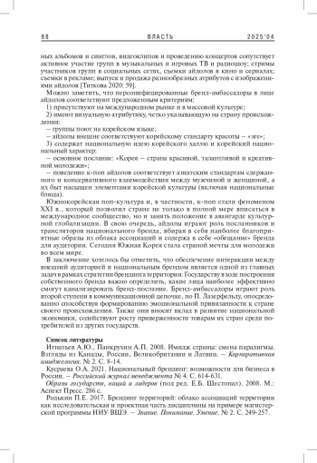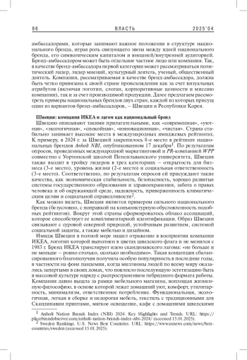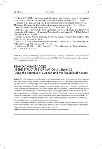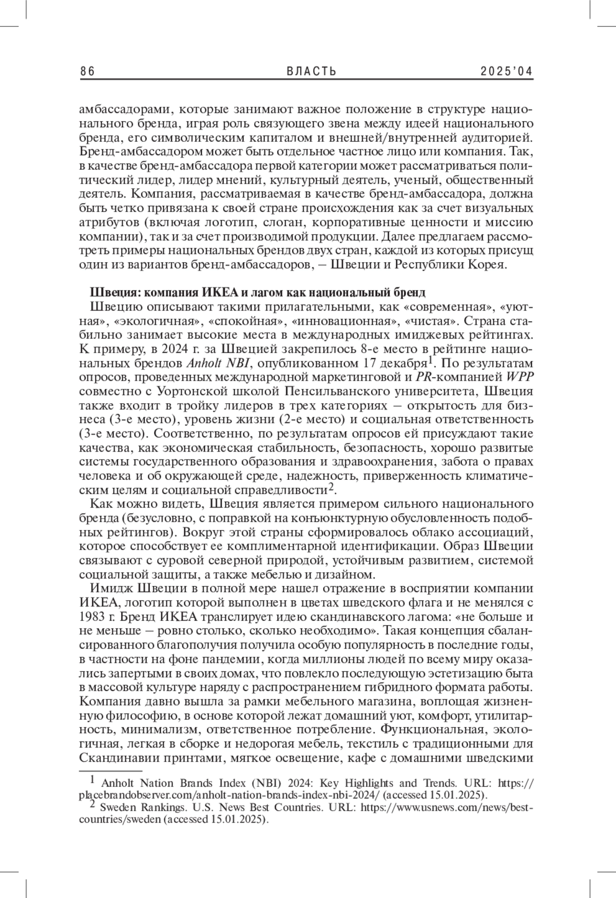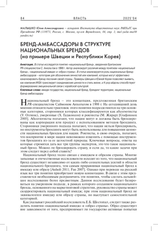 МАЛЫШКО Ю. А. БРЕНД-АМБАССАДОРЫ В СТРУКТУРЕ НАЦИОНАЛЬНЫХ БРЕНДОВ (НА ПРИМЕРЕ ШВЕЦИИ И РЕСПУБЛИКИ КОРЕЯ) // ВЛАСТЬ. 2025. ТОМ 33 № 4