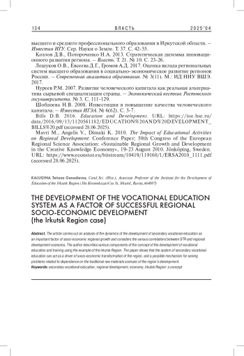 1. Головчин М.А., Соловьева Т.С. 2014. Роль системы образования в социально-экономическом развитии территорий. - Проблемы развития территории. Вып. 2(70). С. 67-77.