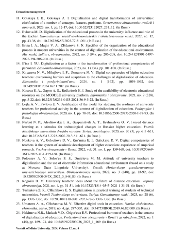 5. Баранова Т. А., Кобичева А. М. Влияние цифровизации образовательных процессов на вовлеченность педагогов // Актуальные проблемы науки и практики. 2023. № 2 (31). С. 123-129.