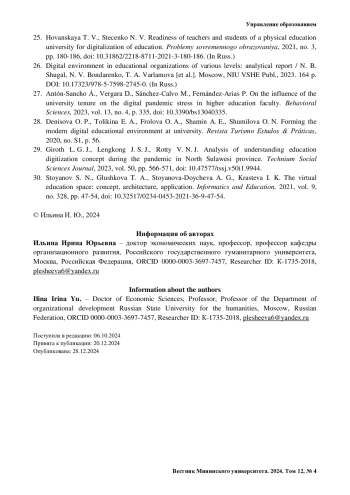 11. Готская И. Б., Готская А. И. Цифровизация и цифровая трансформация вузов: уточнение понятийного ряда, особенности, проблемы // Современное образование: традиции и инновации. 2023. № 1. С. 12-17. https://doi.org/10.51623/23132027_231_12.