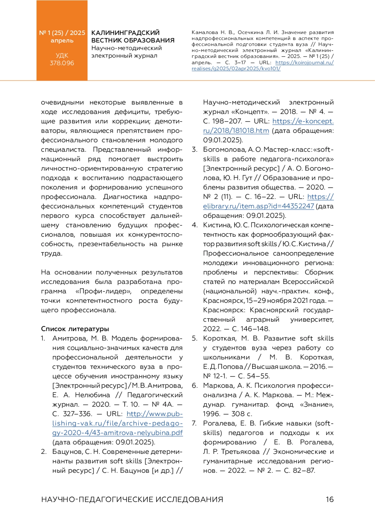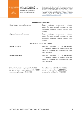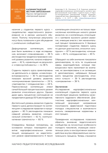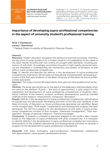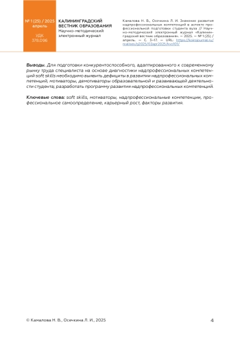 КАМАЛОВА Н. В., ОСЕЧКИНА Л. И. ЗНАЧЕНИЕ РАЗВИТИЯ НАДПРОФЕССИОНАЛЬНЫХ КОМПЕТЕНЦИЙ В АСПЕКТЕ ПРОФЕССИОНАЛЬНОЙ ПОДГОТОВКИ СТУДЕНТА ВУЗА // КАЛИНИНГРАДСКИЙ ВЕСТНИК ОБРАЗОВАНИЯ. 2025. № 1 (25)