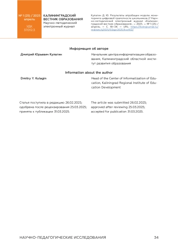 6. Кулагин, Д. Ю. Внедрение ФГИС “Моя школа” в регионе: опыт, проблемы, решения [Электронный ресурс] / Д. Ю. Кулагин, Н. Н. Пустоваченко // Научно-методический электронный журнал “Калининградский вестник образования”. - 2024. - № 1 (21) / апрель. - С. 22-43. - URL: https://koirojournal.ru/realises/g2024/05apr2024/kvo102/ (дата обращения: 26.02.2025).