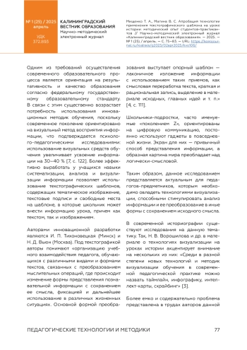 3. Ворошилова, Н. В. Технологии визуализации в преподавании истории и обществознания / Н. В. Ворошилова, А. В. Толмачева, Е. Н. Кукса // Известия Волгоградского государственного педагогического университета. - 2021. - № 2 (155). - С. 43-50.
