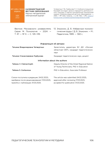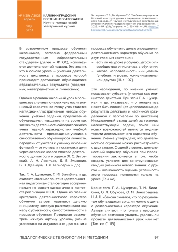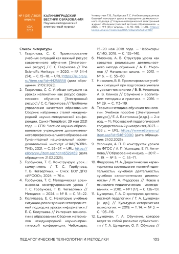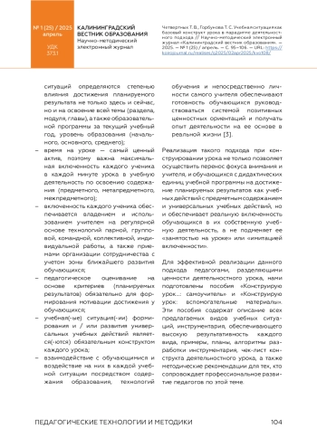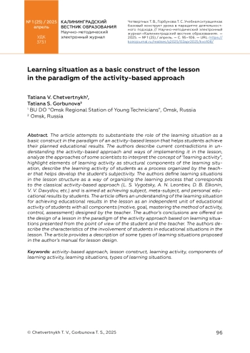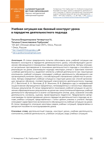 ЧЕТВЕРТНЫХ Т. В., ГОРБУНОВА Т. С. УЧЕБНАЯ СИТУАЦИЯ КАК БАЗОВЫЙ КОНСТРУКТ УРОКА В ПАРАДИГМЕ ДЕЯТЕЛЬНОСТНОГО ПОДХОДА // КАЛИНИНГРАДСКИЙ ВЕСТНИК ОБРАЗОВАНИЯ. 2025. № 1 (25)