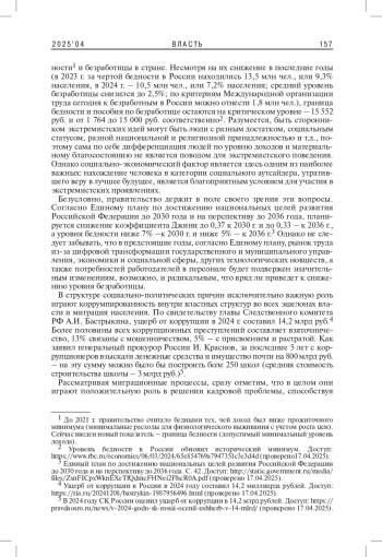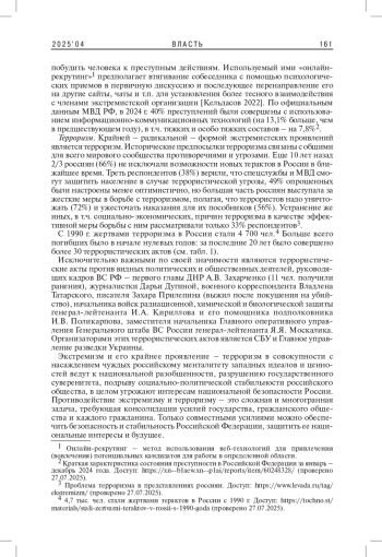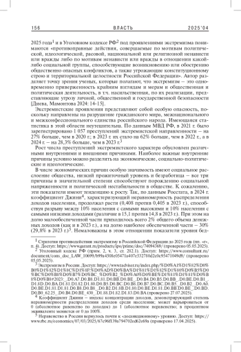 ПИРОГОВ А. И., РАСТИМЕШИНА Т. В. УГРО́ЗЫ НАЦИОНАЛЬНОЙ БЕЗОПАСНОСТИ РОССИИ ОТ ЭКСТРЕМИ́СТСКИХ ПРОЯВЛЕ́НИЙ: СУШНОСТЬ, УСЛОВИЯ ВОЗНИКНОВЕНИЯ И ФОРМЫ ПРОЯВЛЕНИЯ // ВЛАСТЬ. 2025. ТОМ 33 № 4
