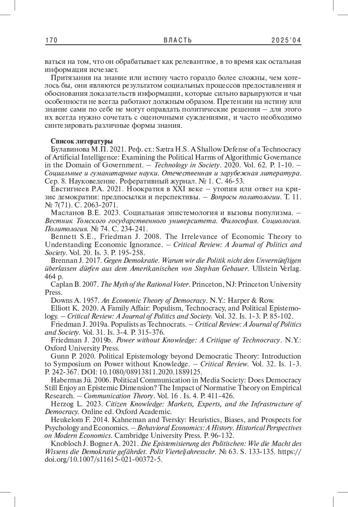 10. Friedman J. 2019b. Power without Knowledge: A Critique of Technocracy. N.Y.: Oxford University Press.