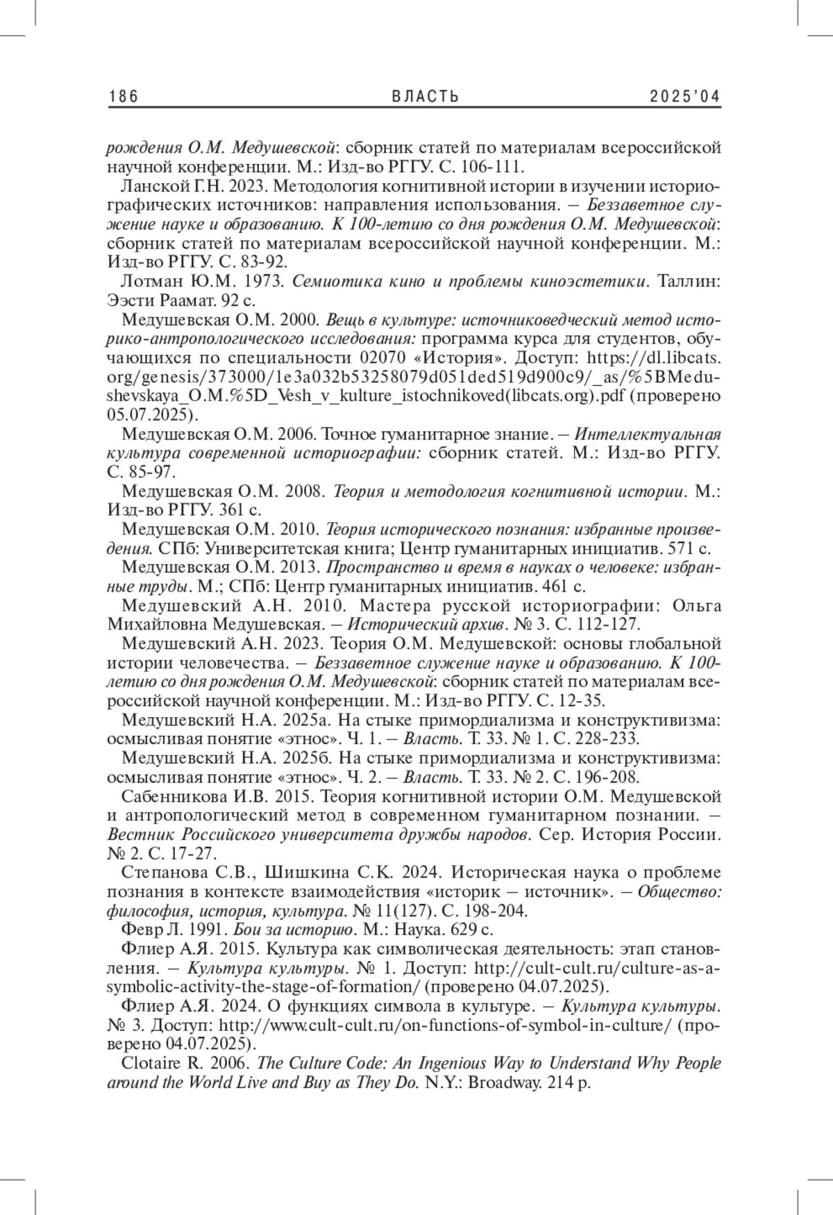 12. Медушевский Н.А. 2025а. На стыке примордиализма и конструктивизма: осмысляя понятие “этнос”. Ч. 1. - Власть. Т. 33. № 1. С. 228-233. EDN: SRJRAA
