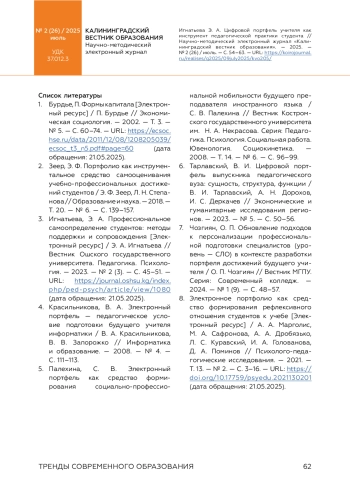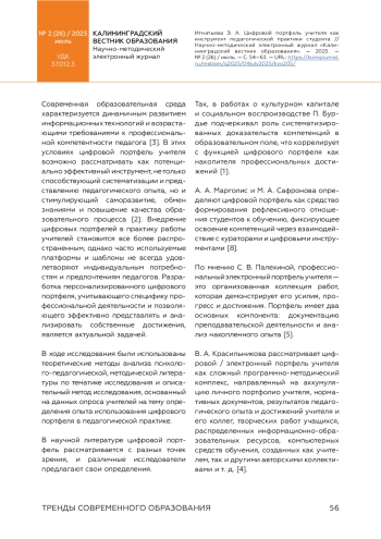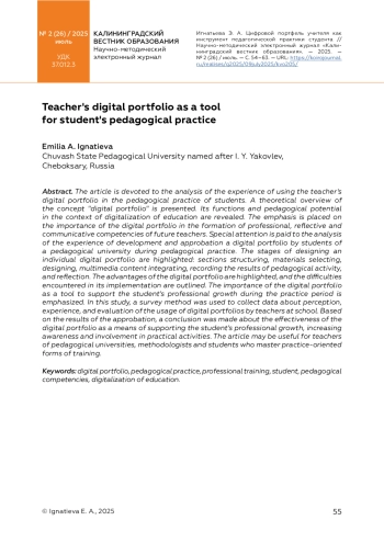 ИГНАТЬЕВА Э. А. ЦИФРОВОЙ ПОРТФЕЛЬ УЧИТЕЛЯ КАК ИНСТРУМЕНТ ПЕДАГОГИЧЕСКОЙ ПРАКТИКИ СТУДЕНТА // КАЛИНИНГРАДСКИЙ ВЕСТНИК ОБРАЗОВАНИЯ. 2025. № 2 (26)