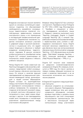 Владение иностранным языком является одной из ключевых компетенций современных студентов, что обуславливает необходимость разработки инновационных педагогических стратегий, способствующих эффективному освоению иностранного языка и его применению в последующей профессиональной деятельности. Современное поколение студентов отличается активным участием в цифровой среде и высокой вовлеченностью в социальные сети, что задает новые тенденции в обучении и требует внедрения альтернативных педагогических подходов. В данном контексте особую актуальность приобретает метод Dogme ELT, который ориентирован на минимализм, живое общение и гибкость учебного процесса.