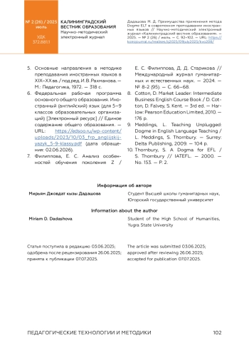 7. Филиппова, Е. С. Анализ особенностей обучения поколения Z / Е. С. Филиппова, Д. Д. Старикова // Международный журнал гуманитарных и естественных наук. - 2024. - № 8-2 (95). - С. 66-68.