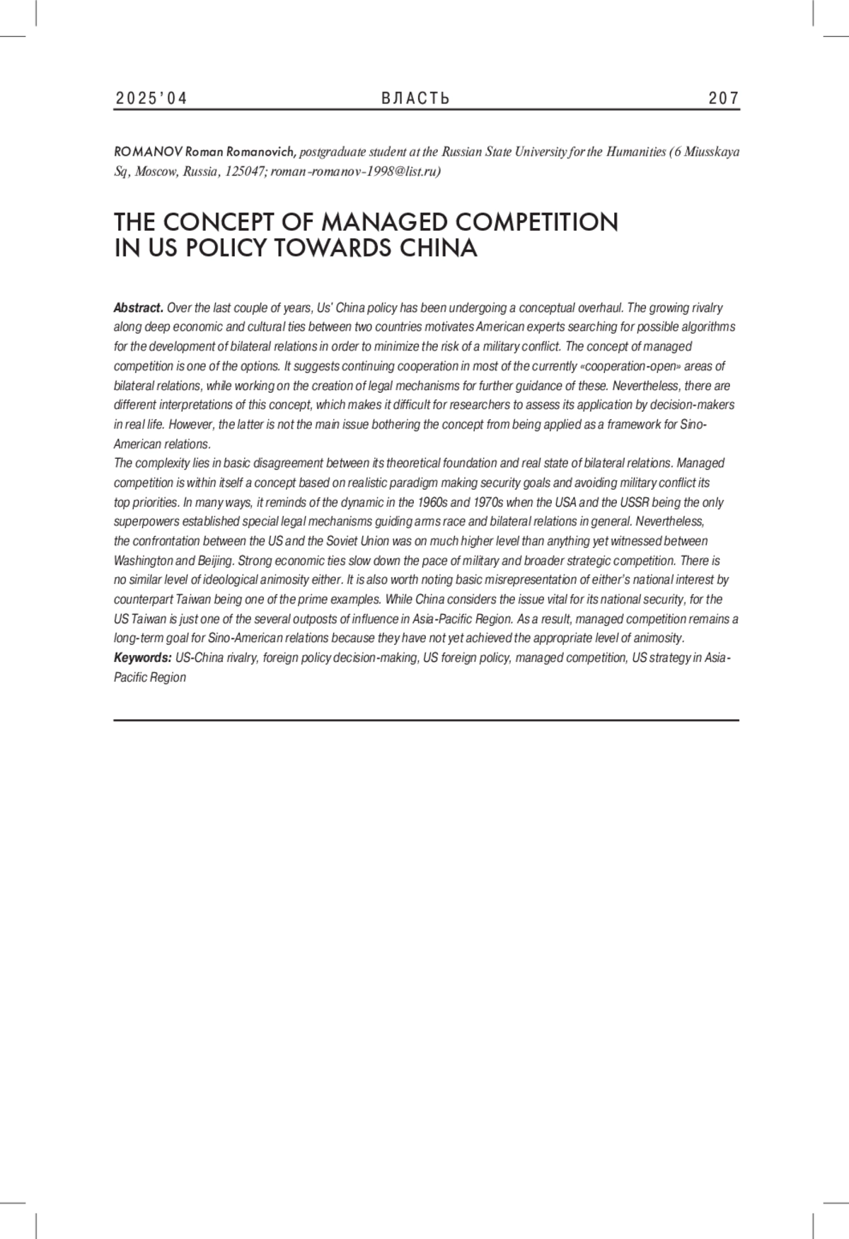 РОМАНОВ Р. Р. КОНЦЕПЦИЯ УПРАВЛЯЕМОГО СОПЕРНИЧЕСТВА В ПОЛИТИКЕ США НА КИТАЙСКОМ НАПРАВЛЕНИИ // ВЛАСТЬ. 2025. ТОМ 33 № 4