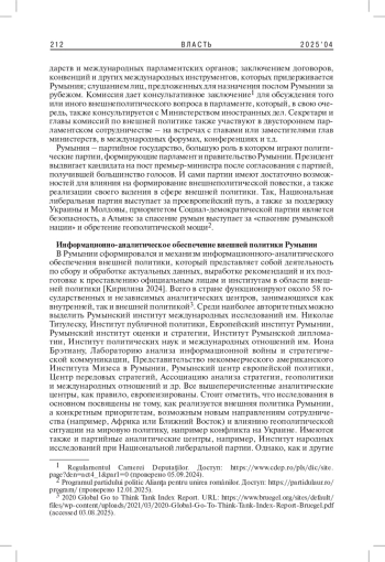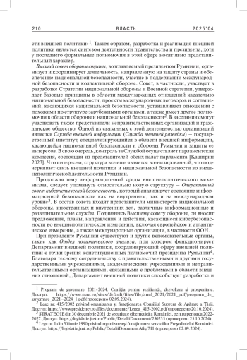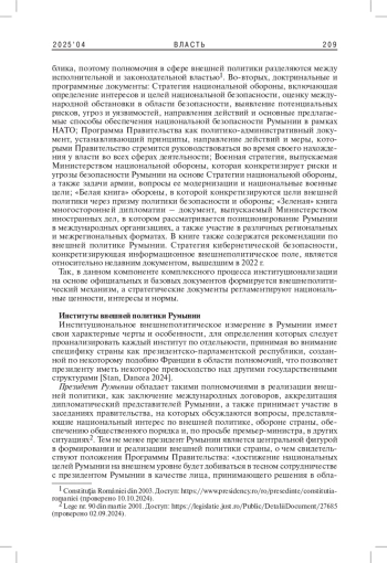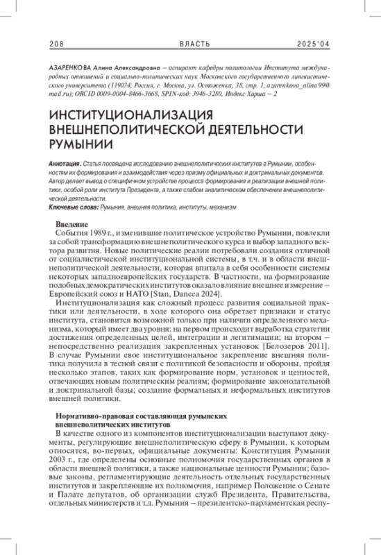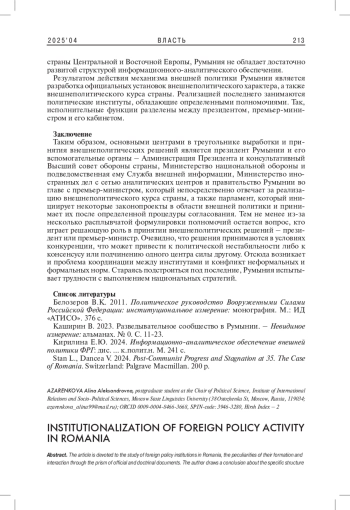 АЗАРЕНКОВА А. А. ИНСТИТУЦИОНАЛИЗАЦИЯ ВНЕШНЕПОЛИТИЧЕСКОЙ ДЕЯТЕЛЬНОСТИ РУМЫНИИ // ВЛАСТЬ. 2025. ТОМ 33 № 4