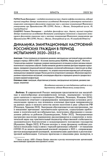 Статья посвящена исследованию динамики эмиграционных настроений среди российских граждан в период с 2020 по 2025 г. На основе анализа данных ВЦИОМа, Левада-Центра, Института Гэллапа авторы выявляют тенденции снижения эмиграционного потенциала на фоне значимых внешнеполитических и внутренних событий. Особое внимание уделяется влиянию факторов пандемии коронавируса, проведения специальной военной операции, внутренней мобилизации и повестки дня на общественные установки. Результаты показывают, что, вопреки классическим моделям push-pull миграции, эмиграционные намерения граждан России достигли исторического минимума. Объяснение видится в усилении патриотических настроений, консолидации общества и переоценке ценности гражданства в условиях мировой конфронтации.