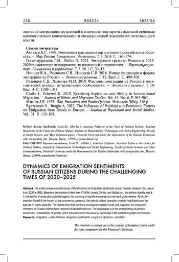 2. Гаджимурадова Г.И., Рабат Л. 2022. Эмиграция граждан России в 2015-2020 гг.: мониторинг современных тенденций и перспектив. - Научный результат. Социология и управление. Т. 8, № 1.С. 33-42. EDN: UWDAON