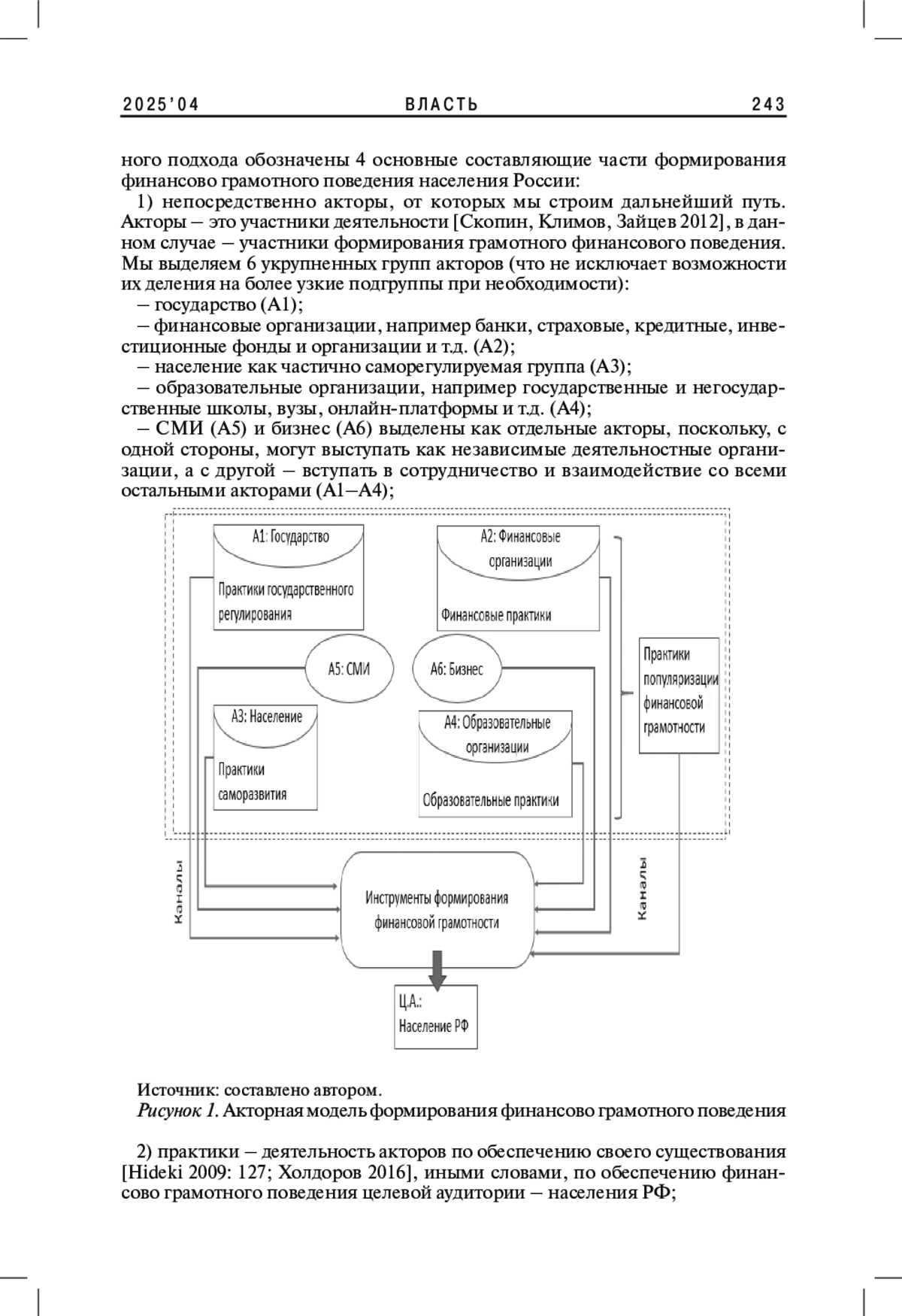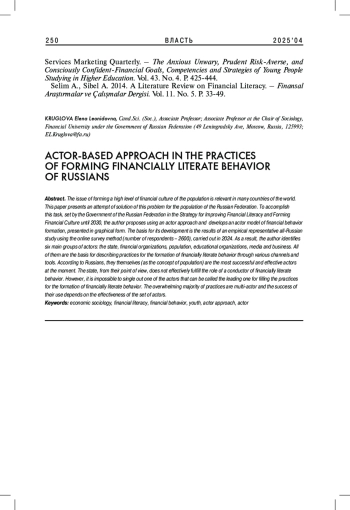 Статья посвящена актуальной теме формирования высокого уровня финансовой культуры населения Российской Федерации. Для выполнения этой задачи, поставленной правительством в Стратегии повышения финансовой грамотности и формирования финансовой культуры до 2030 года, автор предлагает использовать акторный подход и разрабатывает акторную модель формирования финансового поведения. Основанием для ее разработки послужили результаты эмпирического репрезентативного всероссийского исследования методом онлайн-опроса (N = 2600). По результатам опроса были выделены 6 основных групп акторов, которые являются основой для описания практик по формированию финансово грамотного поведения посредством различных каналов.