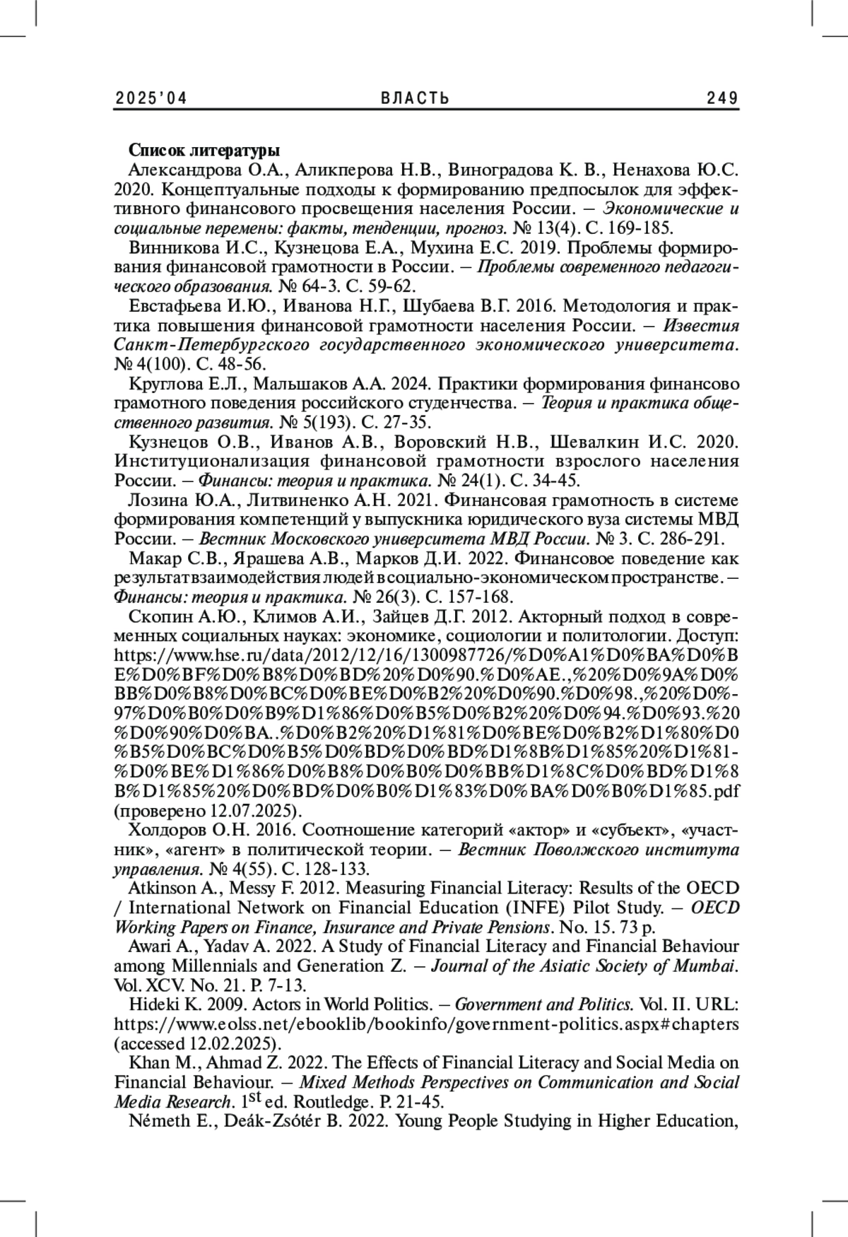 5. Кузнецов О.В., Иванов А.В., Воровский Н.В., Шевалкин И.С. 2020. Институционализация финансовой грамотности взрослого населения России. - Финансы: теория и практика. № 24(1). С. 34-45. EDN: VPTUQO